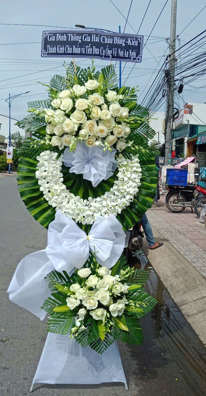 Vòng hoa viếng, còn gọi là kệ hoa chia buồn, là một phần quan trọng trong nghi thức tang lễ. Những lẵng hoa đám tang tại Long Thành thường được thiết kế trang nhã, sử dụng các loài hoa mang sắc thái nhẹ nhàng như hoa lan trắng, hoa cúc trắng, hoa hồng tím,… thể hiện sự tôn kính và chia sẻ nỗi đau cùng gia quyến.